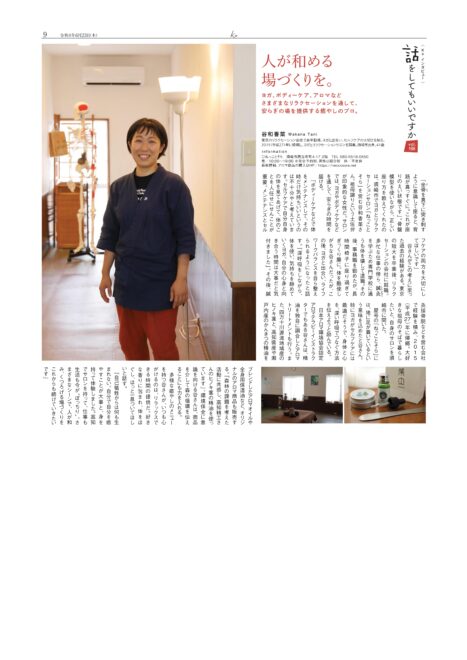 祖母譲りという土佐弁が印象的な女性だ。サロンでは、ヨガやボディケアなどを通して、安らぎの時間を届ける。